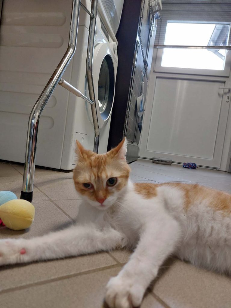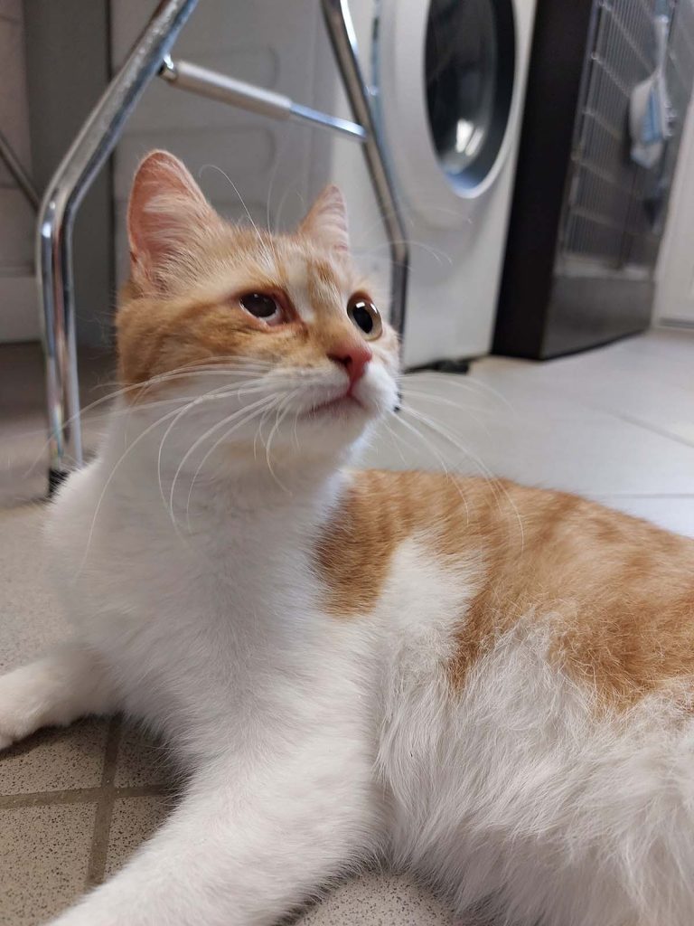 Leider habe ich eine ältere, böse Augenverletzung, die bis dahin unbehandelt blieb. Das Auge hat kaum noch Sehkraft, aber dafür bin ich gut drauf. Ich bin sehr verschmust und neugierig.